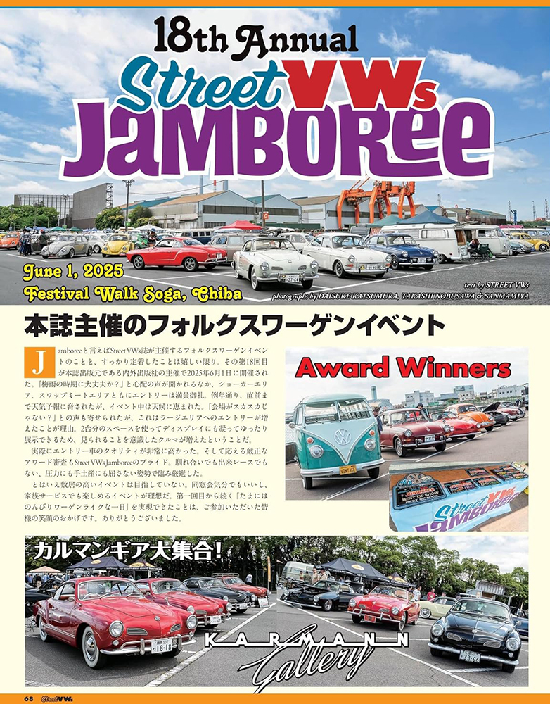 内容の方は、VWバスを中心とした紹介記事のほか、2025年6月に開催された空冷VWのビッグイベント「第18回 Street VWs JAMBOREE」にエントリーした車の紹介や、ヴィンテージVW限定のイベント「KLASSISCHES VW TREFFEN」に参加した全車両(約50台)の紹介など、見どころ満載です。